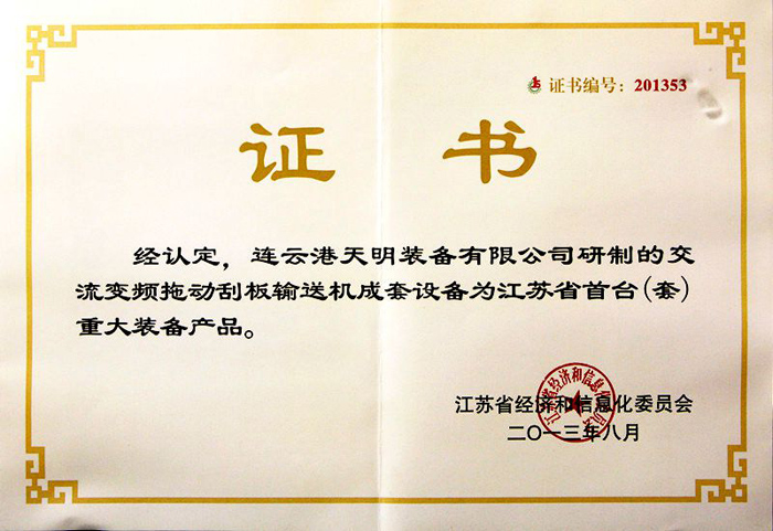 ● 2014年智能化大型变频刮板输送机成套装备承担江苏省重大科技成果产业化项目